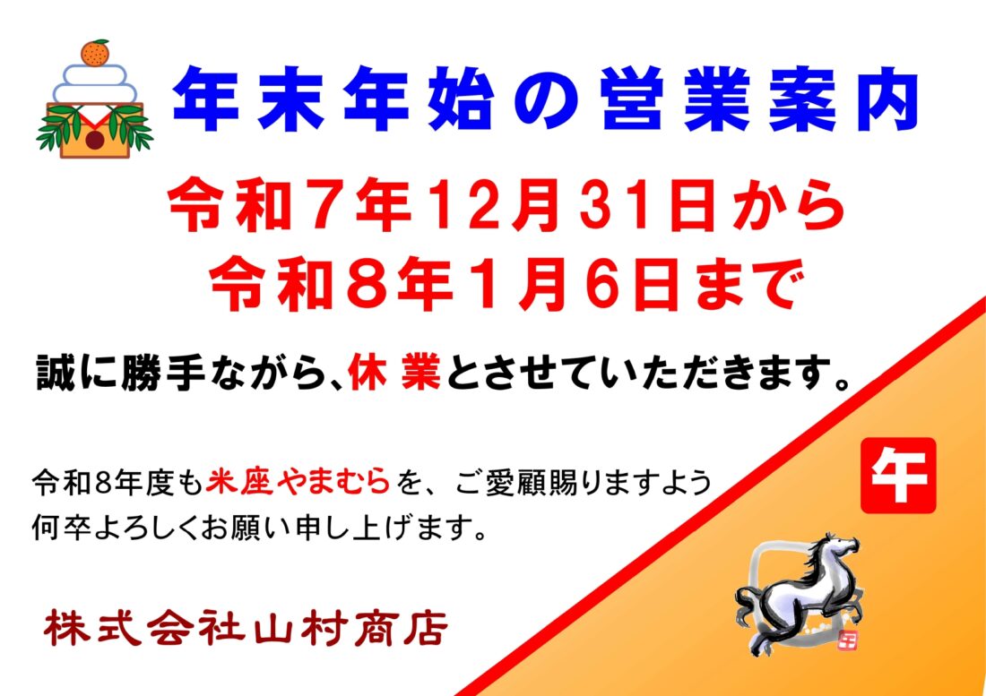 年末年始の営業案内 2025年12月26日 最終更新日時 : 2025年12月26日 米座やまむら 072-365-0036 営業時間 9:30-19:00 [定休日:日曜・祝日] メールでのお問い合わせお気軽にお問い合わせください